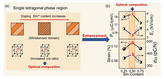 Schematic diagram of the enhanced piezoelectric effect in a single-tetragonal-phase region due to (a) the increased c/a ratio and miniaturized domain, compared with those of the adjacent compositions, showing (b) an increased Pm, strain, and d33 and a reduced EC.