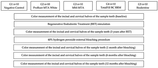 - Santos, L.G.; Felippe, W.T.; Souza, B.D.; Konrath, A.C.; Cordeiro, M.M.; Felippe, M.C. Crown discoloration promoted by materials used in regenerative endodontic procedures and effect of dental bleaching: Spectrophotometric analysis. J. Appl. Oral Sci. 2017, 25, 234–242. [Google Scholar] [CrossRef]