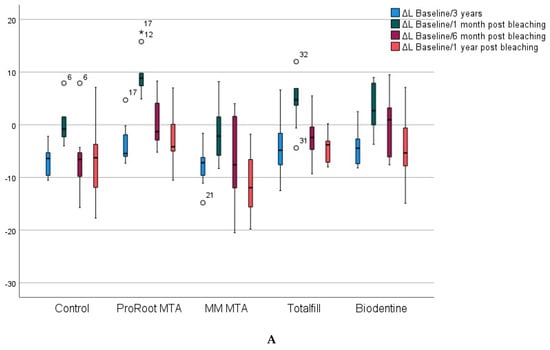 In Figure 2A, a box plot is shown with the median and interquartile range (IQR) of the ΔL value between the baseline and each of the subsequent color measurements. In all groups, there was a reduction in lightness after the three-year follow-up with no significant differences between groups (p > 0.05). TotalFill and Biodentine groups showed the lowest reduction, around 4 points in both groups, while in the rest it was around 6.