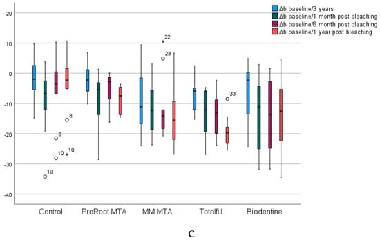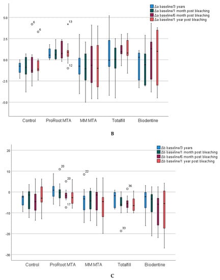 At all times of the study, a reduction of the b component (yellow-blue distance) was found, as can be seen in Figure 2C, in which all the boxes are in negative values. No significant differences were found between the groups at the different times of the study or within each group during the follow-up period (p > 0.05). The greatest variability was found in the MM MTA and Biodentine groups, especially at 6- and 12-months post bleaching.