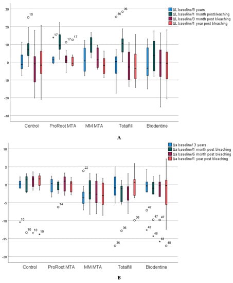 Six months after bleaching, lightness values decreased in all groups, with a significantly higher ΔL in the ProRoot MTA group compared with the MM-MTA and the control group (p < 0.05). Twelve months after bleaching, the MM MTA group showed the greatest reduction in lightness, around 11 units, showing a significant difference compared with the ProRoot MTA group (p = 0.02).