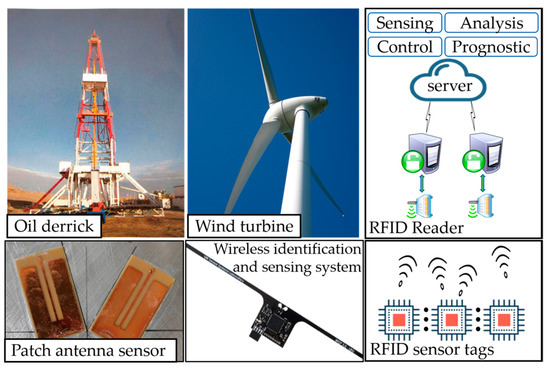 SHM based on wireless sensor networks (WSN) is an attractive option compared to the traditional wired system. Previous SHM adopted cables or wires as the basic tool to form a data acquisition system. This traditional signal transmission method not only has complex wiring but also increases the load of the monitored structures. In addition, the time and effort expended on the maintenance of cables and wires in the later period are also considerable. By removing wiring connections, WSN has more advantages in respect of installation. WSN consists of numbers of distributed sensor nodes that interact with the physical environment, such as humidity, temperature and pressure. These nodes not only have sensing ability but also have embedded processors and wireless communication elements. Therefore, various SHM designs based on WSN have been developed. Alves et al. [4] proposed the wind turbine SHM system called Delphos, which uses wireless sensor nodes composed of accelerometers to obtain blade natural frequency information to predict wind turbine damage. An SHM system was developed for a railway station, which used acceleration, stress, wind load and temperature sensors to obtain health data for the steel structures for the whole life cycle [5]. The WSN-based SHM system makes the large-scale wireless real-time monitoring of structures a reality. However, these nodes require batteries for long-term monitoring, which will increase the cost of large-scale applications for the maintenance and replacement of batteries. This undoubtedly promotes the case for using passive sensor nodes in the field of SHM.