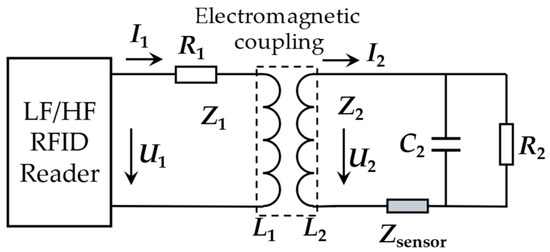 The contactless electromagnetic transmission of time sequence, energy and data between the reader and tags is carried out through the antenna. The antenna is the bridge between the reader and tags, which is responsible for receiving and radiating RF signals. For LF and HF RFID sensing systems, the antenna is usually coils [31,32]. An equivalent circuit of the LF/HF RFID sensing system is pictured in Figure 3.