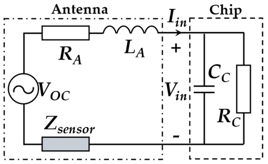 For example, the electrical properties C2 and L2 are sensitive to temperature. The temperature content can be obtained with a solution model. Different from an HF/LF RFID sensing system, the energy and information exchanges between the reader and the UHF sensor tag belong to the backscatter coupling communication, which is based on the radar model. Figure 4 shows the equivalent circuit of the UHF RFID sensor tag. VOC represents the equivalent open circuit voltage of the antenna. Vin is the input voltage obtained by the RFID chip. The impedance [33] of antenna and chip can be expressed as: