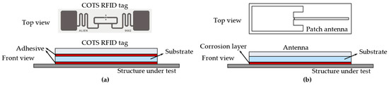 Diagram of RFID crack and corrosion sensor using backscattering: (a) COTS RFID tag as a crack sensor; (b) antenna-based RFID tag as a corrosion sensor.