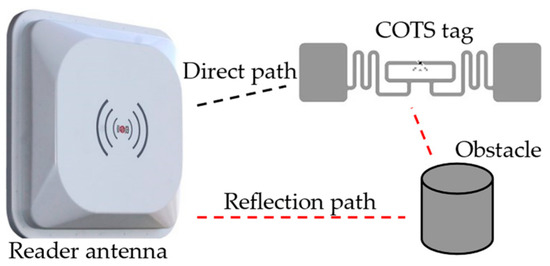 The RFID system’s multipath effect means multiple paths for the reader to read a tag. As shown in Figure 6, it can be divided into the direct path (reader antenna-tag-reader antenna) and reflected path (reader antenna-obstacle-tag-reader antenna). The time of arrival and phase of the received signal will differ for various signal paths. Furthermore, the object movement in the propagation path causes phase shifts and delays in arrival time.