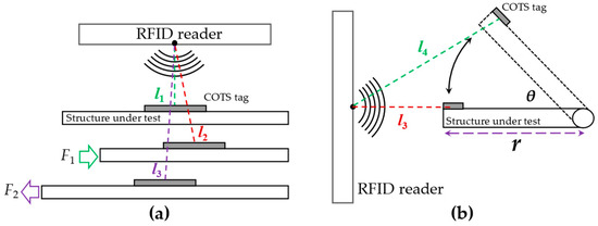 where c is the speed of light in vacuum, f is the frequency of reader carrier, d is the length of the signal path, and φA is the phase shift generated by the reader circuit. It can be seen from Equation (8) that the difference in signal paths will change the phase of the received signal. Therefore, the movement of the tag (within a direct path) can be used to detect deformations and vibration (the tag is attached to the surface of the structure under test). The schematic diagrams of detection systems are displayed in Figure 7.