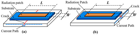 The current path principle is usually employed to crack detection with the antenna-based RFID sensor tag. Taking the rectangular microstrip patch antenna as an example, the working principle of the RFID crack sensor is introduced. As shown in Figure 9, the surface of the structure was seen as the ground plane of the patch antenna. A specific frequency electromagnetic resonant cavity is formed between the radiation patch and the metal ground plate. The rectangular patch antenna includes two basic radiation patterns (TM10 and TM01), and the current directions are different under different radiation patterns. The generation of cracks will increase the path of the current distribution, increasing the antenna sensor’s electrical length in this radiation pattern. For example, a crack parallel to the width of the rectangular patch results in increased current paths along the length of the rectangular path. The resonance frequency f10 corresponding to the TM10 radiation mode is affected, while f01 corresponding to the TM01 is not affected.