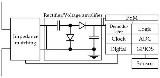 Compared with COTS RFID tags and antenna-based tags, digitally integrated RFID sensor tags have digital circuits. The tag is powered by the radio field generated by the reader. Advanced power supply management (PSM) strategy is integrated into the tag. The sensor and microcontroller are activated after enough energy has been harvested to support their work. The schematic of the digitally integrated RFID sensor tag is given in Figure 11. The RF energy from the RFID reader will be captured and converted to AC power through the antenna. The impedance matching circuit ensures a highly efficient AC flow. Then the AC power is converted to DC power by the rectifier/voltage amplifier. PSM is responsible for storing DC energy and converting it into a stable power supply for logic circuits and sensors.