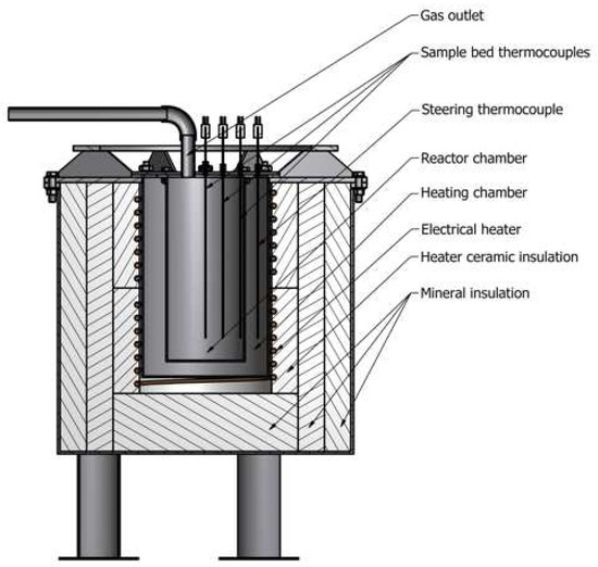 The carbonization of distillery waste was carried out in a laboratory-scale batch reactor (Figure 2). The laboratory reactor consists of two thermocouples. The first thermocouple (T1) was placed at a distance of 20 mm from the chamber wall and 50 mm from the bottom. The second thermocouple was located in the core of the reactor (T2). The reactor was also equipped with an electrical heater with an energy meter to characterize the energy balance of the process.