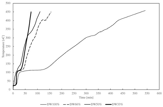 Figure 3 presents the characteristics of the heating rate of the pellets with different contents of distillery waste. The experimental results showed that pellets with a content of 100% distillery waste reached 450 °C in 540 min during carbonization. This sample was also characterized by a long plateau associated with the evaporation of moisture. A decrease in the distillery waste content in the pellets to 33% caused an increase in the heating rate and shortened the process to 75 min. A decrease in the content of distillery waste also decreased the power input (recorded with an energy meter) to maintain a constant temperature in the chamber, from 5.3 kWh for DW100% to 1.3 kWh for DW33%.