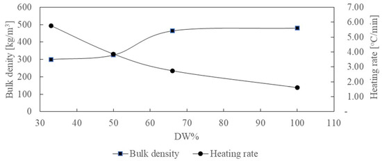 This aspect is also caused by different bulk densities (Figure 4). For the pellets with a content of 100% distillery waste, the bulk density was 480 kg/m3, and the heating rate of the bed during carbonization reached 1.6 °C/min. A decrease in the distillery waste content in the pellets to 33% caused a decrease in bulk density to 300 kg/m3 and an increase in the heating rate to 5.7 °C/min. The change in the bulk density of the pellets due to the participation of distillery waste also influenced the change in the bulk density of the obtained biochar, which was 480 kg/m3, 464 kg/m3, 325 kg/m3, and 300 kg/m3 for DW100%, DW66%, DW50%, and DW33%, respectively.