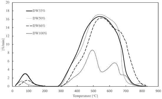 Figure 5 presents the DTG curves of the char from the different carbonization pellet compositions. The obtained results indicate that the increases in DW content in the pellet mixture from 33% to 100% led to an increase in ignition temperature (Ti) from 305 to 343 °C. Moreover, increases in distillery corn waste caused a decrease in the average burning rate from 10.5%/min for DW33% to 4.2%/min for DW100% (Table 5). Wang et al. [37] indicate that this aspect is mainly caused by the combustion of fixed carbon and volatile. A decrease in the fixed carbon and volatile content may lead to a higher average combustion rate.