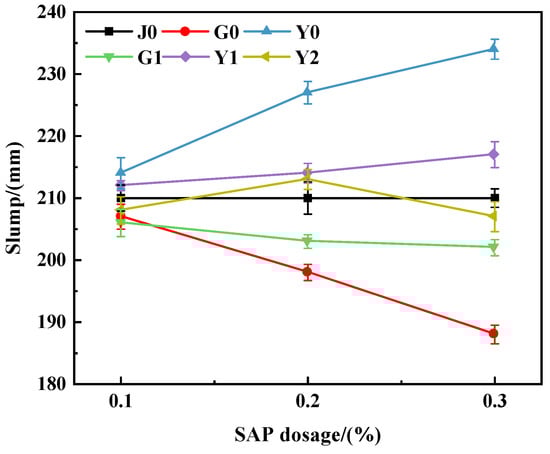 As can be seen from Figure 1, under the five incorporation methods, the slump of the Y0 group was significantly higher than that of the J0 group and showed an obvious increasing trend with the increase in SAP content; the slump of group G0 was significantly lower than that of group J0, and decreased with the increase in SAP content; the slump was slightly reduced in the G1 group; and the slumps of the G1, Y1 and Y2 groups were similar to that of the J0 group.