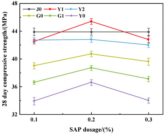 After the SAP content exceeds 0.2%, the strength of each group generally decreases. It is speculated that the main reason may be the uneven distribution of water in the matrix caused by the addition of excessive SAP [46]. Subsequently, due to the large number of pores in the concrete during the hardening stage, the compressive strength decreases [47,48,49]. The compressive strength of G0 and Y2 decreased due to the formation of holes in the concrete by the SAP. The strength of the G1 group and Y0 group decreased, on the one hand, because the incorporation of the SAP formed holes in the concrete; on the other hand, it was also because additional water or the SAP’s additional release of water reduces the water-binder ratio of concrete, thereby reducing the strength of concrete.