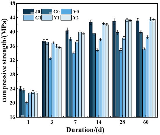 The development trend of the compressive strength of group Y1 and group Y2 is relatively consistent. In the early stage, the intensity development was slower, whereas in the later stage, the intensity development speed was faster, but the overall difference was small. The development trend of the compressive strength of the G0 group and G1 group was basically the same, which shows that the early strength developed faster and the late strength developed slower; the 7-d compressive strength reached 90% of the 28-d compressive strength, and the later compressive strength growth was only 2.7 MPa and 2.6 MPa, respectively, which finally stabilized at 39.8 MPa and 35.2 MPa. The compressive strength of the Y0 group was consistently lower than that of the other five groups; the 7-d compressive strength reached 80% of the 28-d compressive strength, and the later compressive strength increased slowly with age.