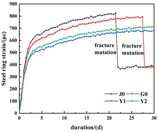 It can be seen from Figure 4 that with the increase in curing age, the circumferential compressive stress of the inner steel ring increased gradually, and the initial microcracks were observed in the J0 group and G0 group. It can be seen from the strain curves of the steel ring that the stress of the steel ring decreased after adding the absorbent resin, which indicates that adding an absorbent resin can effectively reduce the shrinkage of concrete; the reduction was 25% in group G0 and 30% in groups Y1 and Y2.