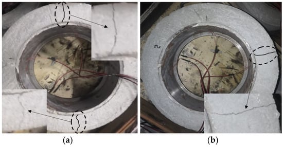Cracks in concrete rings (the left is J0, and the right is G0). (a) Two cracks appeared in the concrete ring; (b) A crack appeared in the concrete ring.