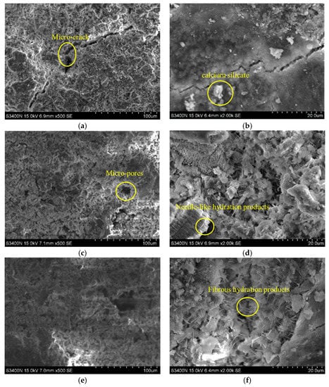 SEM image of concrete sample. (a) J0 (×500); (b) J0 (×2000); (c) G0 (×500); (d) G0 (×2000); (e) Y1 (×500); (f) Y1 (×2000).