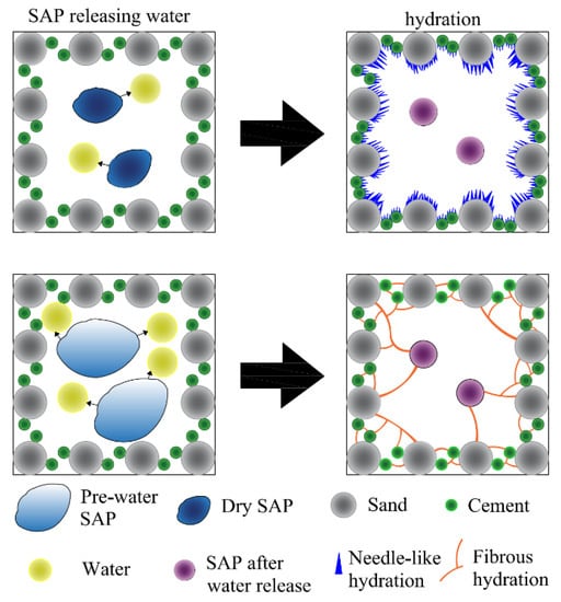 Therefore, the incorporation of an SAP slows down the early hydration rate, and the cement is further hydrated after water release; thus, water is released in the later stage of cement hardening and the hydration process is prolonged, which improves the compacting degree of concrete and enhances its crack resistance.