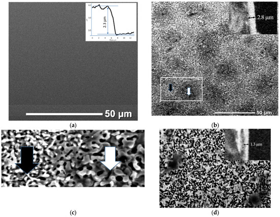 Тype M films have a smaller FWHM of the {000n} family’s reflections, which indicates large crystallite sizes. A direct calculation of the coherent scattering region using the Scherrer formula gives an estimate of the crystallite sizes of 87 nm for type M film and 29 nm for type A film. In this case, the grains of type A film were larger and rounded according to the corresponding AFM image (Figure 1c). Taking into account the smaller size of crystallites of the type A film, it can be argued that large grains are formed as a result of sintering of individual crystallites. In general, there is likely to be a large temperature drop in the near-surface layers of the sample during the treatment in the A mode. The surface layers, which are in direct contact with the plasma, evaporate rapidly, but in the deeper layers, heating is insufficient for crystallization processes to occur. The film is partially melted from the surface and crystallized during quenching (Figure 1c). In the case of the samples treated in the M mode, the dependence of temperature on the depth of the layer was more uniform. The increase in the type M film’s thickness, in comparison with the initial type I film, was associated with its oxidation and an increase in porosity due to recrystallization after the melting stage during the treatment. According to the SEM (see Figure 3a–c) and AFM data, as a result of plasma treatment, the surface of the film was transformed from smooth to coarse-grained, with sharp relief drops up to several micrometers. Significant differences were observed in the roughness structure of the films (Figure 3).