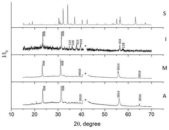 X-ray diffraction pattern of the corresponding BaM samples normalized to maximum. Insets: cross section images. Designations: *, reflection of the sapphire substrate. S—standart, I—initial, М—treatment at 4 ÷ 5 kK, A—treatment at 8 ÷ 10 kK.