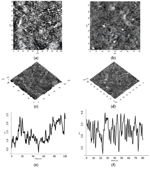 Comparisons of the root-mean-square (RMS) roughness according to AFM data for different scan sizes are carried out. For type M and A films, the following roughness values Rq were obtained: 338 nm (for M) and 238.8 nm (for A) in the case of a 10 × 10 µm2 scan; 349.9 nm (for M) and 588.9 nm (for A) in the case of a 100 × 100 µm2 scan. The scale dependence of the RMS roughness on the size of the AFM scan is known, and our results for type A films correspond to it. The presence of the dependence is evidence of the isotropic topography of the surface of the type A film. For type M films, the scale dependence is weak, which indicates a violation of surface isotropy.