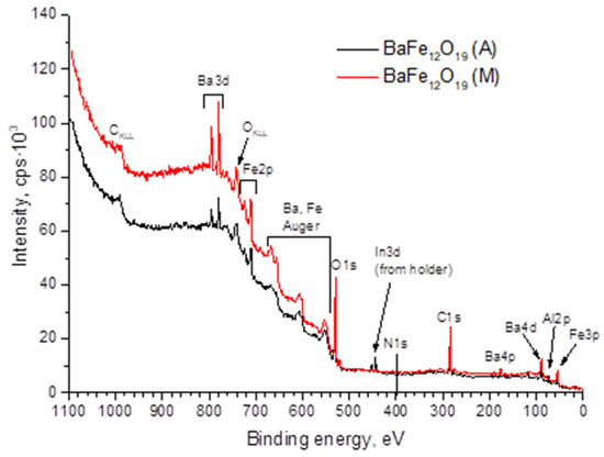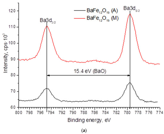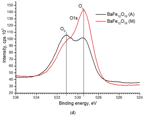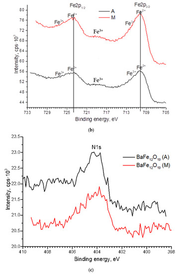 In Figure 5 the spectra of Ba3d, Fe2p, O1s, and N1s are presented. The barium spectrum exhibits two peaks, Ba3d3/2 and Ba3d5/2, separated by 15.4 eV. This energy difference between the line maxima indicates the oxidized state of barium [24]. The magnetic properties of BaM are significantly affected by the valence state of Fe; therefore, the Fe2p1/2 and Fe2p3/2 peaks were studied in detail. The deconvolution of the Fe2p1/2 and Fe2p3/2 peaks indicates that the two main components are Fe2+ (724 eV), Fe3+ (726.6 eV) and Fe2+ (710 eV), Fe3+ (712 eV). A satellite peak at around 719 eV indicates the existence of Fe3+ [25]. It can be seen that the intensity of the 719 eV peak did not change during processing in different modes. The energy position and shape of the N1s nitrogen line (Figure 5c) most closely matches its state in relation to oxygen N-O [26]. Oxygen (Figure 5d) has two pronounced maxima OL and OS, with energies of 529.5 eV and 531.1 eV, respectively. The OL maximum is related to its bond in the lattice, and OS is related to oxygen vacancies [27]. As indicated in Figure 5d, when processing in mode M, the intensity of OL increases in comparison with mode A, while the intensity of Os decreases. This can be related to the transition of oxygen atoms from BaM lattice nodes to interstitial positions. Taking into account the increase in the thickness of the sample after treatment, it can be assumed that the oxygen atoms diffusing into the sample from the surrounding atmosphere also occupy the interstitial position. Thus, the approximation of the parameter dМ = 0.288 nm to the standard parameter d = 0.29 nm can be associated with lattice expansion due to interstitial oxygen atoms. For processing in high-temperature regime A, taking into account the closeness of the parameters dА = 0.2855 nm to the parameter of the initial sample dI = 0.2851 nm, as well as the XPS data, we can say that there were no significant changes in the precipitate: all elements were desorbed from the surface—therefore, a decrease in the concentration of individual components was observed (Table 1).