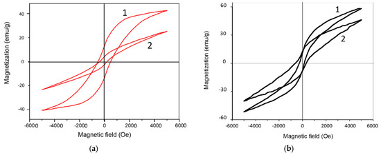 Curves of the magnetic hysteresis of BaM films processed in the M (a) and A (b) modes. Designations: 1—out-of-plane; 2—in-plane.