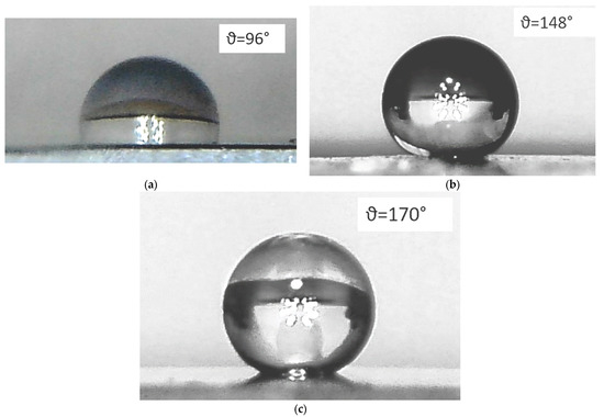 The hydrophobicity of sample surfaces was analyzed (contact angle ϑ was measured) using the sessile droplet method. The measurements were performed at a relative humidity of 40–45%. The optical visualization was performed using a digital photographic camera. A 5 mm3 water droplet was applied onto a substrate. The measurements were performed 30 s after the droplet was applied to achieve its stable state. The axis of camera objective was located at the level of the water-droplet–sample-surface interface. The contact angle was measured according to the procedure described in [23].