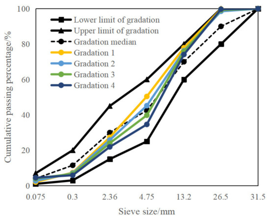 By controlling the passing percentage of the 4.75 mm sieve, the gradation of CRM was adjusted. Accordingly, the proportion of aggregates in each grade was changed, triggering the passing percentage of the 4.5 mm sieve as 35%, 40%, 45%, and 50%, respectively. The passing percentage of each sieve is shown in Figure 1. For the above four gradations, the amount of emulsified asphalt of 3.3%, 3.6%, and 3.9% was used for each gradation. The optimum water content of the four gradations was determined by the geotechnical method, reaching 5.2%, 5.1%, 4.9%, and 4.8%, respectively.