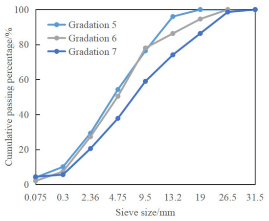 Three CRM gradations (represented by Gradations 5–7) of fine-grained (AC-13), medium-grained (AC-20), and coarse-grained (AC-25) were designed, respectively. The passing rate of each sieve is shown in Table 5. The three grading curves are shown in Figure 2. The low-temperature performance index selected in (1) was used to evaluate the low-temperature performance of the above three types of CRM with coarse, medium, and fine grading. For the above three gradations, the optimum water content determined by the geotechnical method is 5.7%, 5.2%, and 4.9%, respectively. According to the cold recycling technical specifications, the optimum emulsified asphalt dosage of the above three gradations is determined to be 3.0%, 3.5%, and 3.9%.