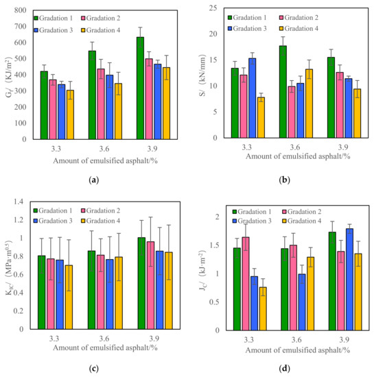 The test results of fracture energy, S, KIC, and JC of CRM under different gradations and emulsified asphalt contents are shown in Figure 3.