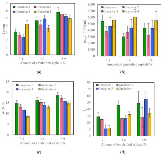 The test results of Ls, |m75|, ICT, and fracture work of CRM under different gradations and emulsified asphalt dosages are shown in Figure 4.