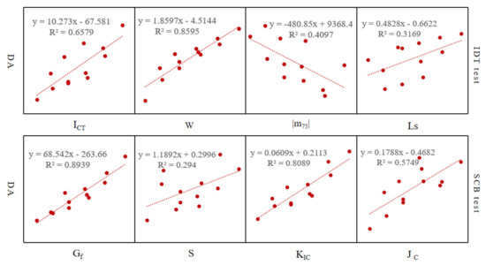 It can be seen from the correlation analysis results in Figure 5 that with the increase in the thickness of the new asphalt film, the corresponding ICT, fracture work, fracture energy, KIC, and JC gradually increase, |m75| gradually decreases, and Ls also gradually increases, indicating that CRM becomes soft, the deformation resistance increases, and the crack growth rate also decreases. Therefore, the low-temperature performance of CRM is improved. The change rule of S is contrary to that of other indexes, which indicates that this index is not suitable for evaluating the low-temperature performance of CRM. At the same time, the correlation coefficient results show that the fracture work, fracture energy, and KIC are all greater than 0.8, and the other indicators are all lower than 0.7, which indicates that the above three indicators are sensitive to the change of new asphalt film thickness. Therefore, considering the discrimination of each indicator to different test schemes and the variability of data results, this paper suggests that when evaluating the low-temperature performance of CRM, for the SCB test method, The fracture energy index is recommended, and the fracture work index is recommended for the IDT test method.