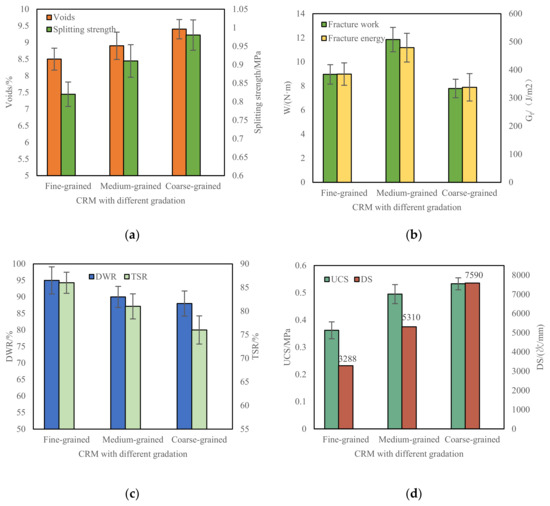 Performance and voids test results of CRM under different gradation. (a) Voids and RT; (b) W and Gf; (c) DWR and TSR; (d) UCS and DS.