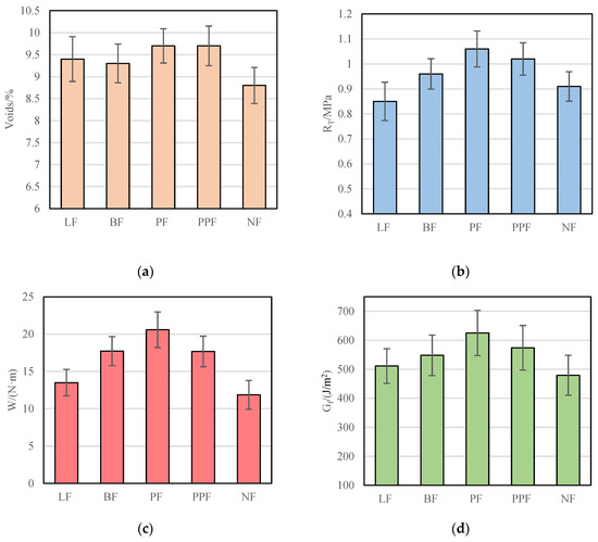 The test results of voids, dry splitting strength (RT), fracture work, and fracture energy of CRM of polyester fiber (PF), basalt fiber (BF), lignin fiber (LF), polypropylene fiber (PPF), and no fiber (NF) are shown in Figure 7.