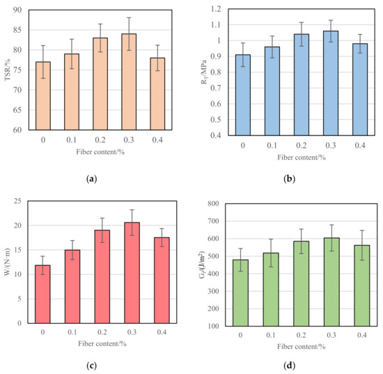 The test results of voids, dry splitting strength (RT), fracture work, and fracture energy of CRM under different fiber contents are shown in Figure 8.