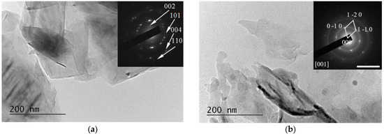 All the examined suspensions contained microcrystals of graphite. Their quantity was higher in the HQ graphite sample than the LQ graphite sample according to the specifications of the producer for the crystallinity of the two types of graphite samples. An investigation of the particles’ crystalline states using the diffraction mode of the microscope demonstrated the presence of an amorphous mass in the HQ graphite treated with a solution of 6% H2O2 in water, which probably caused a decrease in the crystals after treatment with the H2O2 solution. Amorphous material was detected in the LQ graphite sample even before the H2O2 treatment. Additionally, the TEM characterization of all the suspensions studied showed the formation of different phases after the PLA processes depending on the initial graphite and the composition of the liquid phase of the suspensions: