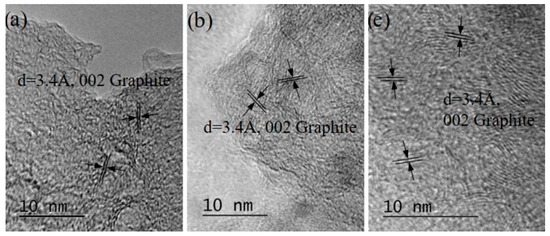 The amorphized carbon fraction usually formed small spherically shaped particles with a diameter between 50 and 150 nm and an amorphous structure, which may be often related to the disordered C60 fullerene (COD # 96-800-0216) (see Figure 12a). The diffusely blurred polycrystalline SEAD rings (see Figure 12b) corresponded to the interplanar distances of fullerene C60 (COD # 96-800-0216), whereas those in Figure 12e corresponded to hexagonal graphite (COD # 96-101-1061). We attributed the observed widening of interplanar distances to three main reasons: (i) the noticeable increase in the amorphized phases; (ii) the bonding of oxygen and oxygen-containing carbon radicals along the edges of the {001} planes of hexagonal graphite and the penetration and non-covalent bonding of oxygen and oxygen-containing carbon radicals between these planes; (iii) the agglomeration of nano-sized phases during the drying of the samples. At present, we cannot clearly determine the influence of these factors.