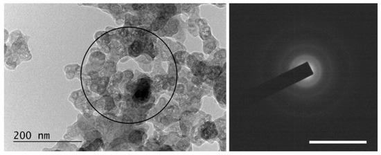 - Relatively small (5–10 nm) 3D particles sedimented on the amorphous particles. These 3D particles were almost spherically shaped (Figure 12a) and possessed relatively clear SAED rings corresponding to the amorphous fullerene C60 (COD # 96-800-0216) (see Figure 12b), with HRTEM images showing inter-planar spacing consistent with fullerene C60 (COD # 96-800-0216) (see Figure 12c). Spherical particles that consisted of amorphous graphite were also observed. Such particles were more frequently observed irradiated by λ = 266 nm wavelength suspensions.