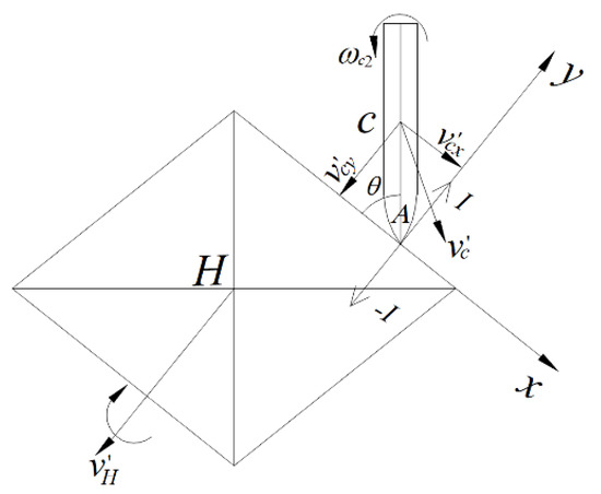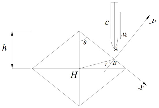 The diamond-shaped moving target has central symmetry, so only one of its four surfaces is analyzed. The kinematic models of the projectile and the diamond-shaped moving target before and after the impact are respectively displayed in Figure 3 and Figure 4. The center of mass of the diamond-shaped target is H, and its mass and moment of inertia are, respectively, and . The distance between its centroid and top is , where the top indicates the point of the spire. The centroid of the projectile is c, the mass of the projectile is mc, and the moment of inertia of the projectile around its centroid is . The angular velocity of the projectile, , before the impact is 0, and its velocity is , which is equal to its flight speed.
