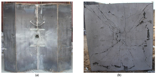 In the case of a diamond-shaped moving target, the comparative tests of Test 3 and Test 2 were carried out at impact point 1 and 2 of the target, respectively, with a velocity of about 400 m/s, and the front and back photos of the target plate after impact are shown in Figure 12 and Figure 13, respectively. Although the projectile did not penetrate the target plate at impact point 1, as shown in Figure 13b, the projectile deflection angle was only about 15 degrees, which was significantly smaller than the result at impact point 2. From the front of the target, the projectile penetrates the diamond-shaped moving target and forms a deflection, and continues to invade the concrete fixed target at a certain angle of attack, and at impact point 2, the steel plate on the surface of the concrete fixed target is ruptured and turned outward due to the large angle of attack, as shown in Figure 12a.