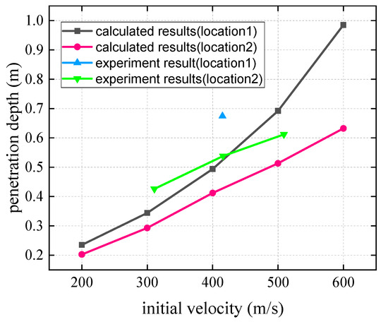 Theoretical calculation results show that for the two different impact positions, the depth of penetration generally increases with the increase in the initial impact velocity. When the impact velocity is identical, the depth of penetration at impact position 1 is deeper than that at impact position 2. The experimental results are largely consistent with the calculated results.