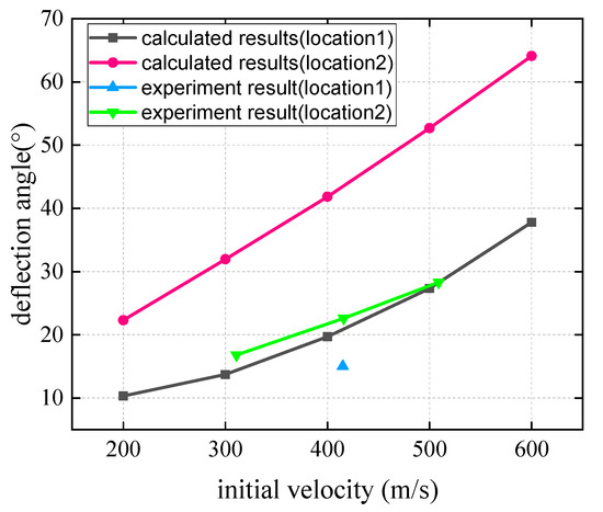 Considering the two different impact positions, the deflection angle of the projectile increases with the impact velocity. Under the same impact velocity, the deflection angle of the projectile at impact point 2 is larger than that at impact point 1. Similarly, the experimental results are in good agreement with theoretical values.