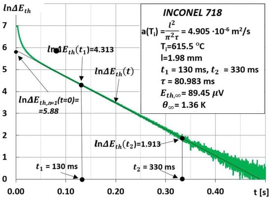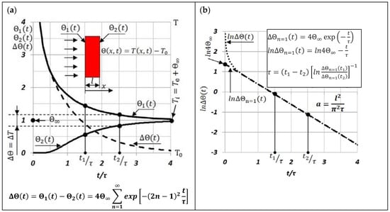 The method of determining the characteristic time τ and thermal diffusivity at the temperature based on the course of changes in the function , where is shown in Figure 3.