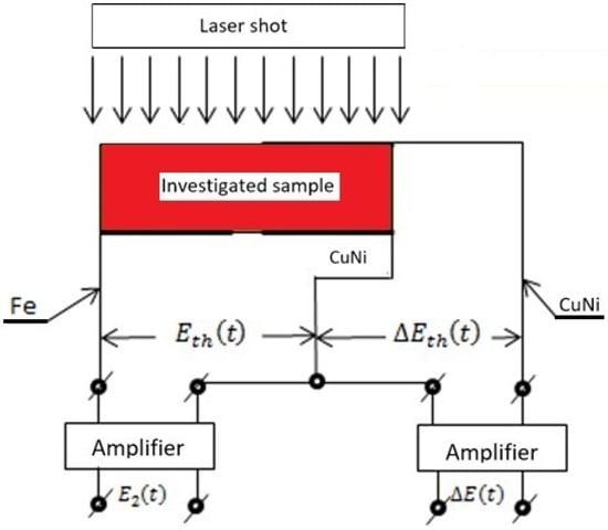 Since the Seebeck coefficient of the tested material is usually unknown, and its value is necessary to determine the temperature increase of the tested sample after a laser shot at its front surface, the following procedure was used to determine it. On one hand, the thermocouple used to determine the temperature rise on the back surface of the sample = should be selected so that its temperature characteristics are known , and hence the ability to specify the value of . On the other hand, in the course of the same experiment, the characteristic time τ and the values , were determined simultaneously from the parallel registered changes , as shown in Figure 2.