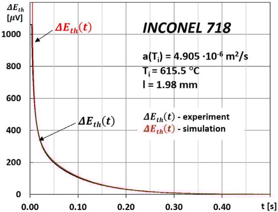 The measure of the correctness of the and the characteristic time τ values determined by this method, and thus the thermal diffusivity , are the result of comparing the changes from the experiment with their simulation, as shown in Figure 3.