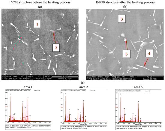 The structure of the solid γ solution with precipitates within the grain boundaries of the IN718 alloy before the heating process (a) and after the heating process (b) with exemplary EDS spectra (see Table 2) from the marked areas (c).