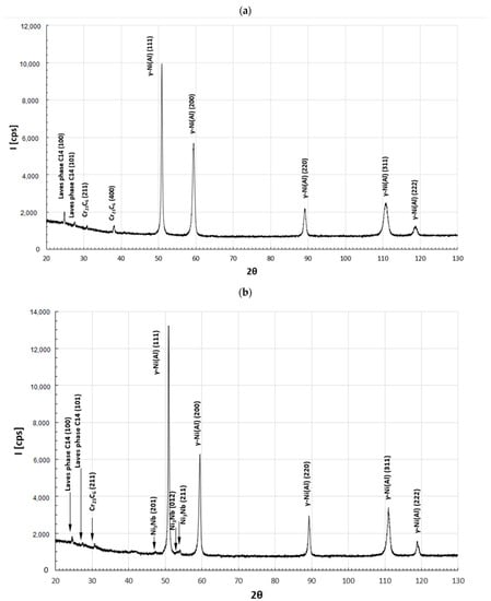 XRD patterns obtained for the IN718 alloy before the heating process (a) and after the heating process (b).